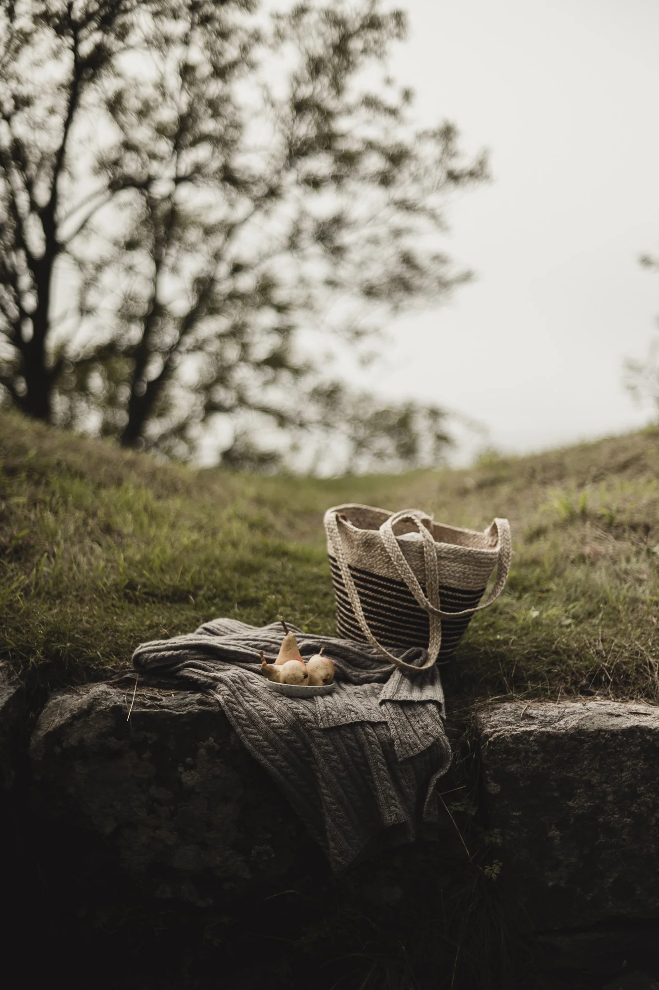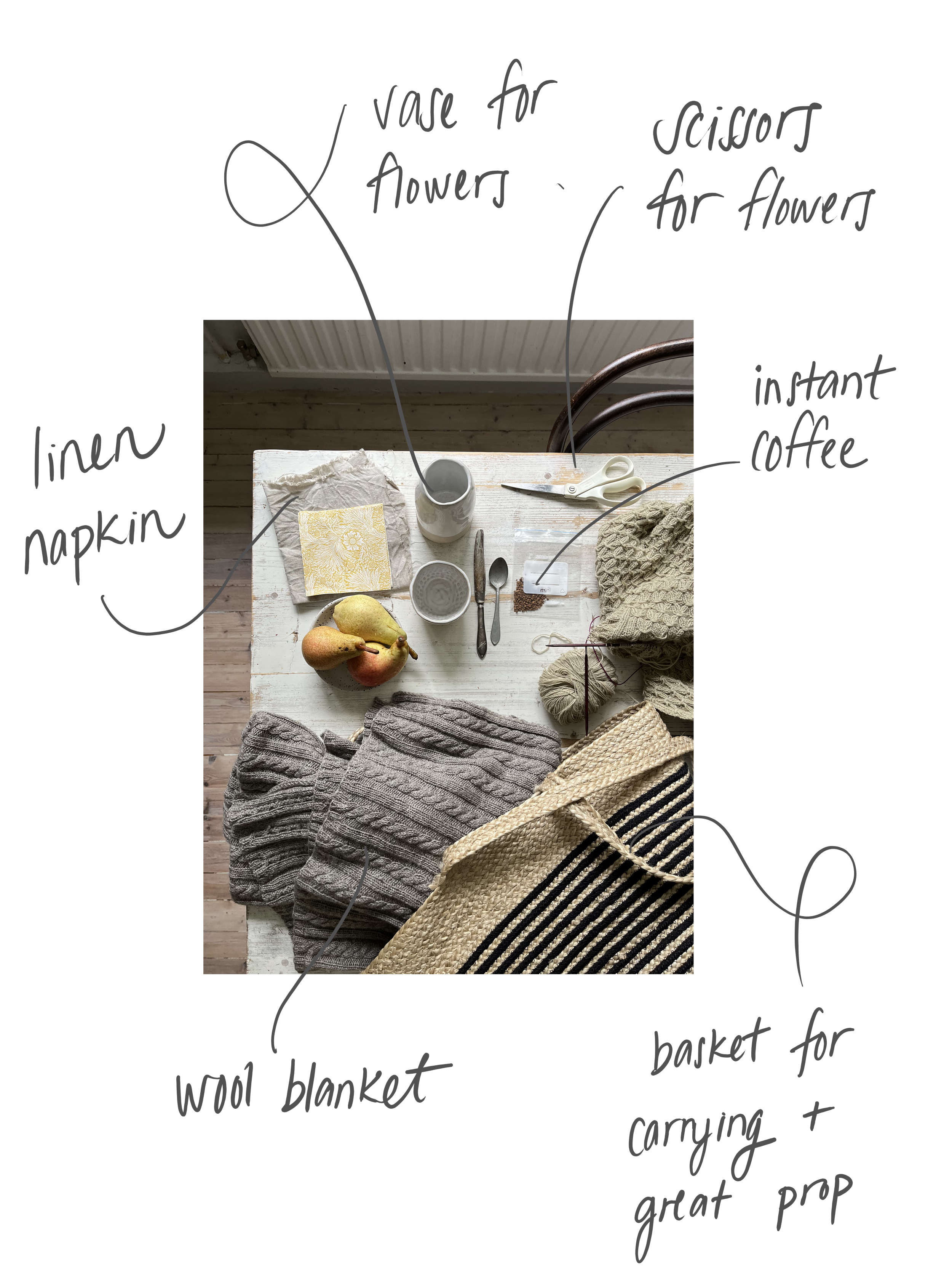 Below you can see a photo of the props I packed for an outdoor photoshoot. My story goes like this: Someone, well, me, enjoys a calm picnic moment after wandering on cliffs. There is a quiet little corner by the rock where the sea breeze can´t find me, and there I eat a delicious cinnamon bun, fresh pears, and a warming cup of hot chocolate.